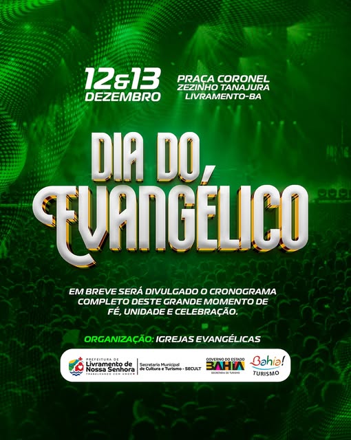 Para celebrar o Dia do Evangélico, que acontece em 30 de novembro de cada ano, a Prefeitura de Livramento de Nossa Senhora, através da secretaria municipal de Cultura e Turismo, está programando para os dias 12 e 13 (sexta-feira e sábado) do próximo mês de dezembro, duas grandiosas noites de festejos ‘gospel’, com shows de artistas conhecidos nacionalmente que animarão a Praça Coronel Zezinho Tanajura, centro, nesta cidade. As atrações musicais ainda serão divulgadas segundo os organizadores do evento evangélico.