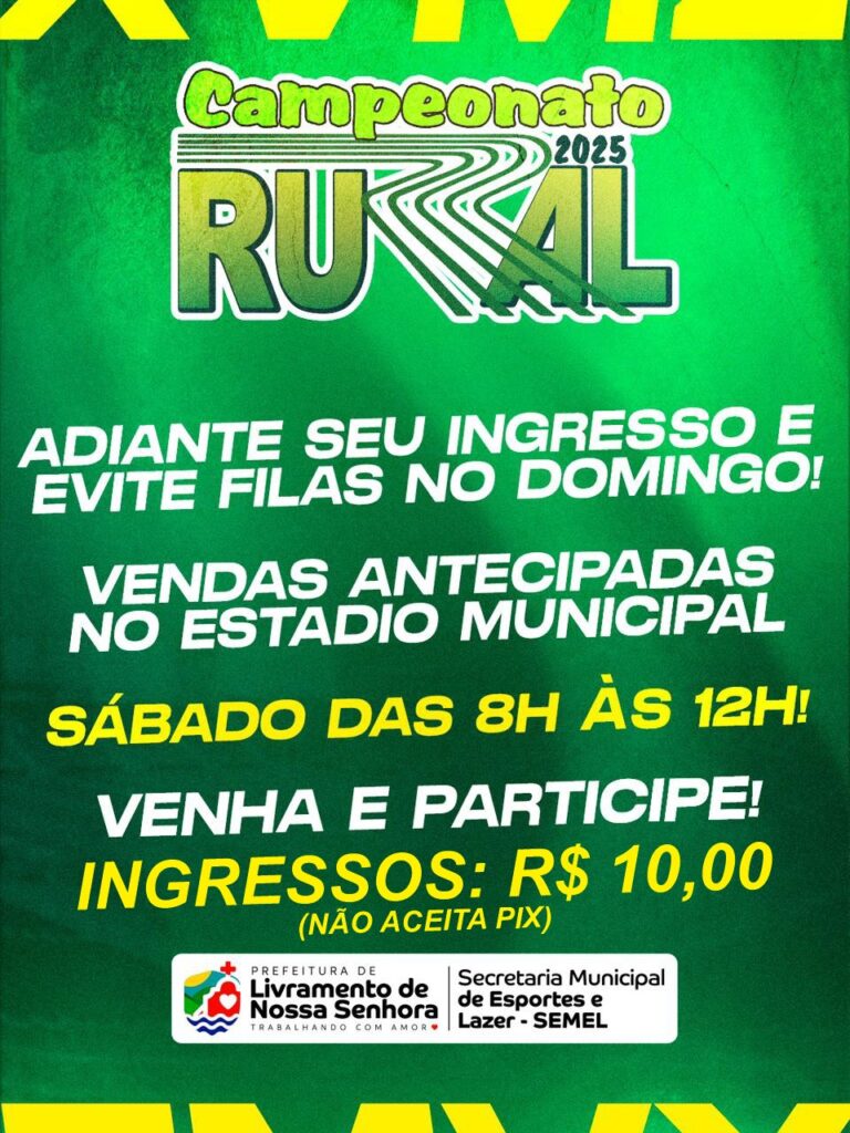 A Prefeitura de Livramento de Nossa Senhora, através da Secretaria Municipal de Esportes e Lazer – SEMEL, informa que o Estádio Municipal Dr. Edilson Ribeiro Pontes sediará, neste domingo (7/12), as partidas de ida das Semifinais do Campeonato Rural 2025.